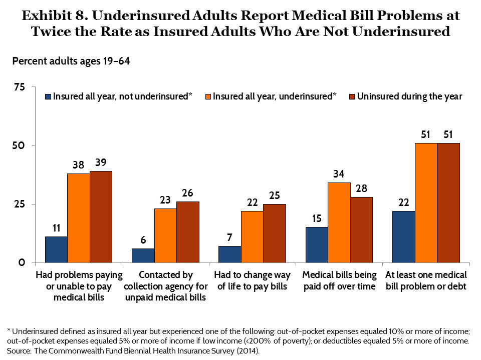 Below is the key chart showing the significance of underinsurance in terms of people’s ability to get needed medical care – 44% of underinsured Americans report at least one cost-related access problem (see chart below). Also last week, the consumer organization Families USA released a report based on Urban Institute data showing the as many as 1 in 4 insured American adults skipped needed medical care last year because they could not afford it. This is a real problem that needs attention.