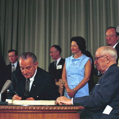 Fifty years ago this Thursday, July 30th 1965, President Lyndon Baines Johnson signed into law legislation creating two new national health insurance programs, Medicare and Medicaid. Fifty years later, these programs appear as recognizable and durable as any monuments in Washington DC. That’s an illusion because there’s little difference between the Lincoln and Jefferson Memorials today versus 1965. On the other hand, Medicare and Medicaid today look radically different from the law signed by LBJ as former President Harry Truman looked on.